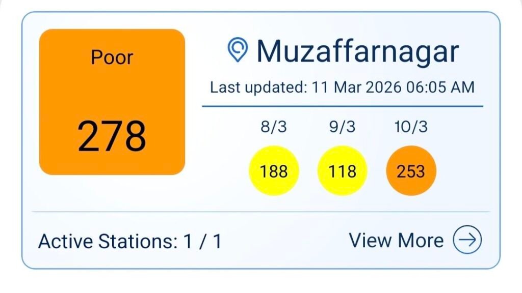 मुजफ्फरनगर। ज़िले में बुधवार सुबह करीब 8 बजे हवा का AQI (Air Quality Index) 278 पहुंच गया – यानी ‘बहुत खराब’ श्रेणी में। सांस लेना मुश्किल हो गया, आंखों में जलन, गले में खराश और सीने में भारीपन महसूस करने वाले लोगों की संख्या बढ़ गई। कई इलाकों में लोग घरों से बाहर निकलने से कतराने लगे।