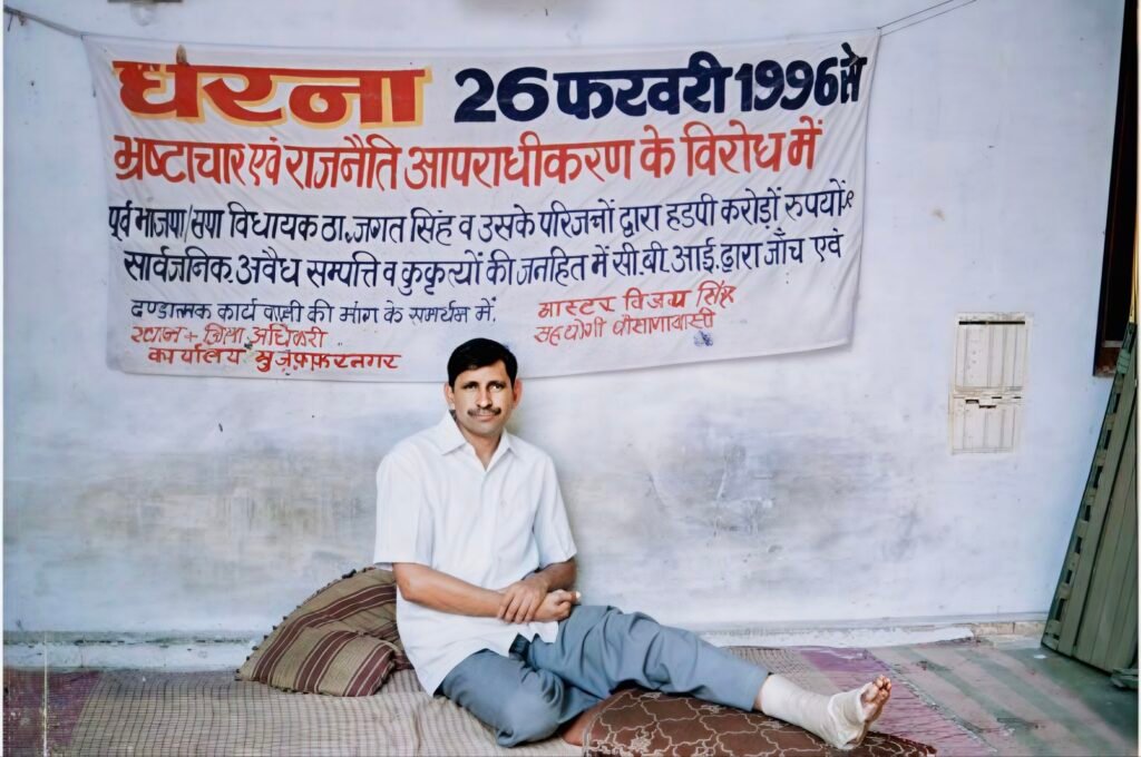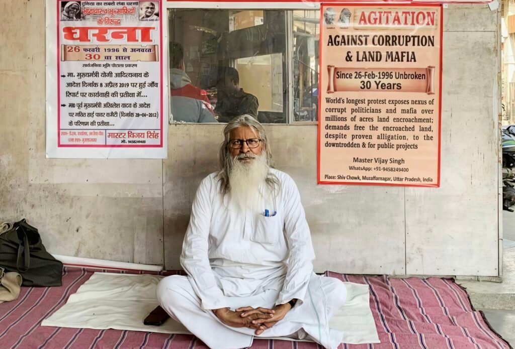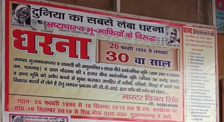 मुजफ्फरनगर। भ्रष्टाचार और भू-माफियाओं के खिलाफ मास्टर विजय सिंह का धरना 30 साल पूरे कर चुका है। 26 फरवरी 1996 को जिला कलेक्ट्रेट पर शुरू हुआ यह सत्याग्रह अब दुनिया का सबसे लंबा धरना बन चुका है।