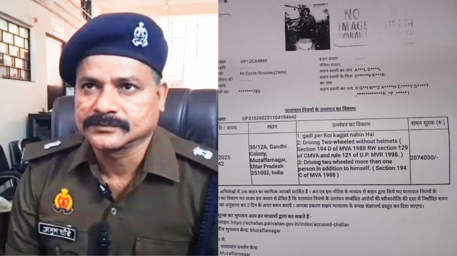 मुजफ्फरनगर की नई मंडी कोतवाली की गांधी कॉलोनी चौकी पुलिस ने UP12 CA 9880 नंबर की स्कूटी पर 20,74,000 रुपये का चालान काट दिया। बिना कागजात, हेलमेट और ड्राइविंग लाइसेंस के चेकिंग के दौरान पुलिस ने इस कारनामे को अंजाम दिया। सीज और वायरल हंगामा चालान के बाद स्कूटी सीज कर ली गई। मामला सोशल … Continue reading पुलिस ने स्कूटी का काटा ‘20 लाख’ का चालान! वायरल होते ही मचा हड़कंप, एसपी ने मानी ‘तकनीकी गलती’!