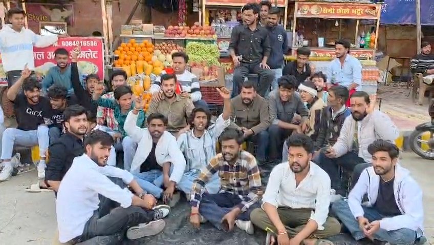 मुजफ्फरनगर जिला अस्पताल के बाहर मुस्लिम फल विक्रेता द्वारा अंधे साधु के साथ मारपीट के विरोध में हिंदू संगठनों ने धरना दिया और हनुमान चालीसा